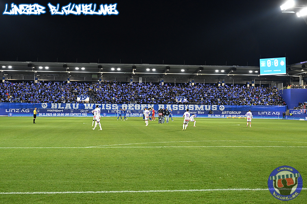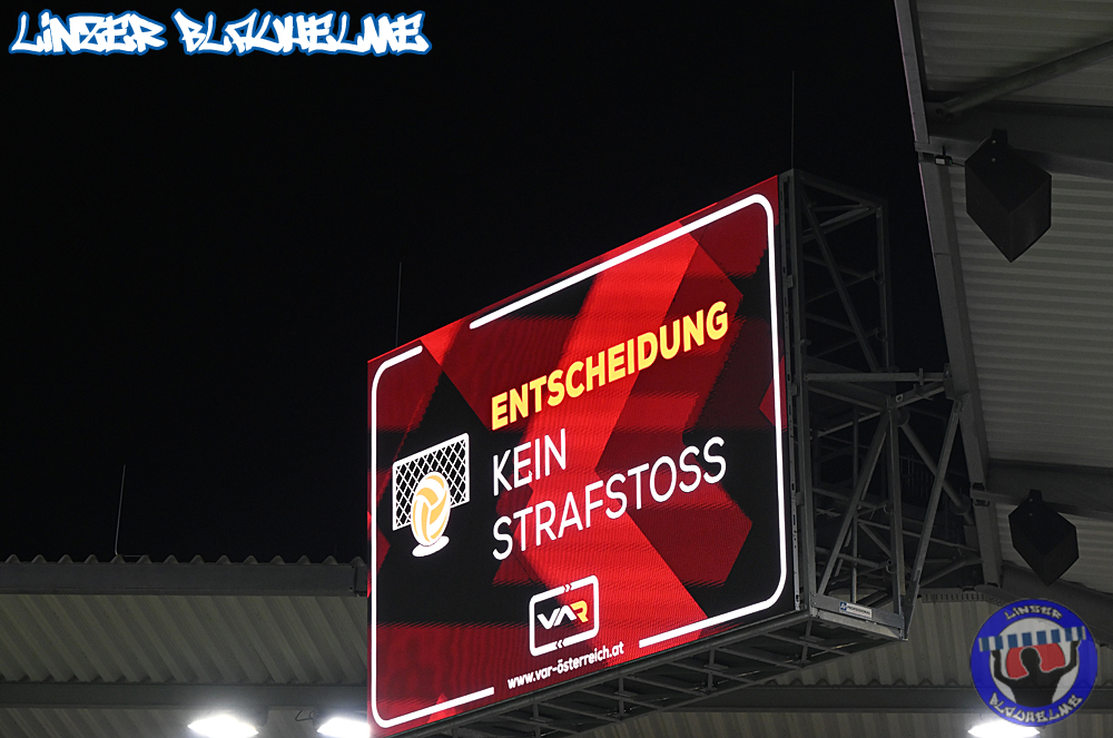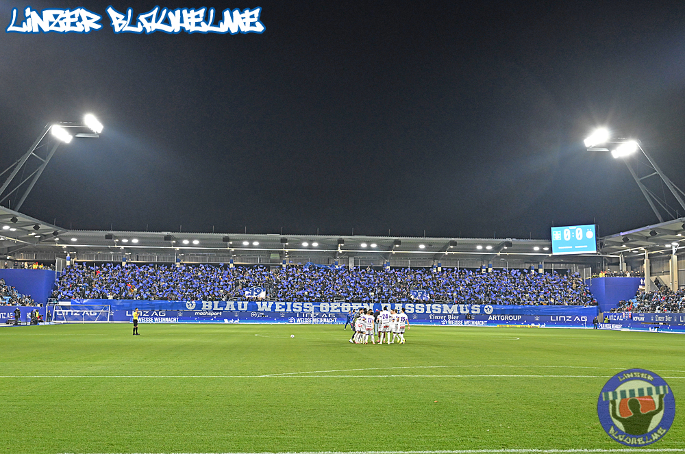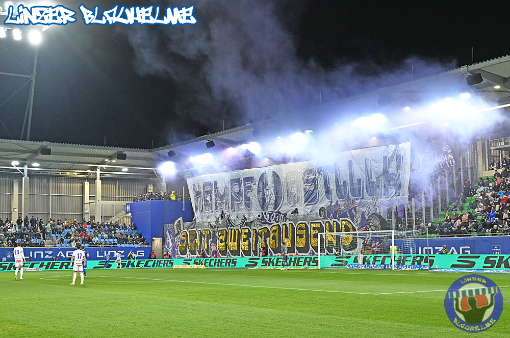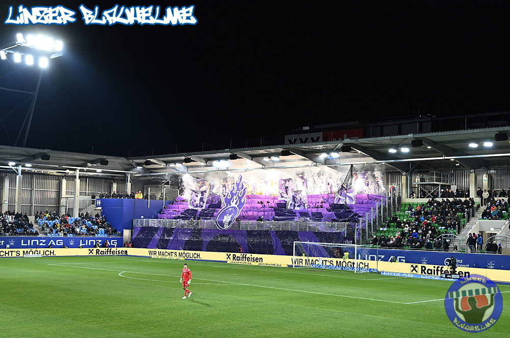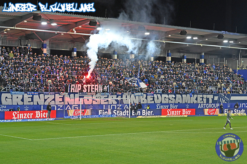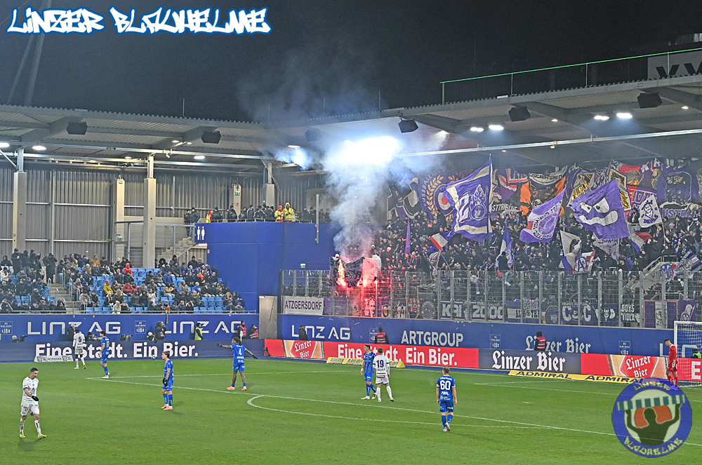 Das Gegenüber beging mittels mehrteiliger Choreo ein Jubiläum. Ebenfalls erinnert wurde an einen Fahnenklau in den 90ern, indem das damals erbeutete FC Linz Fans gegen Rechts Banner angezündet wurde. Man hätte 30 Jahre Zeit gehabt um über die eigene Dummheit nachzudenken, hob sie nun aber auf ein nochmal tieferes Level.