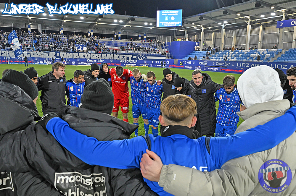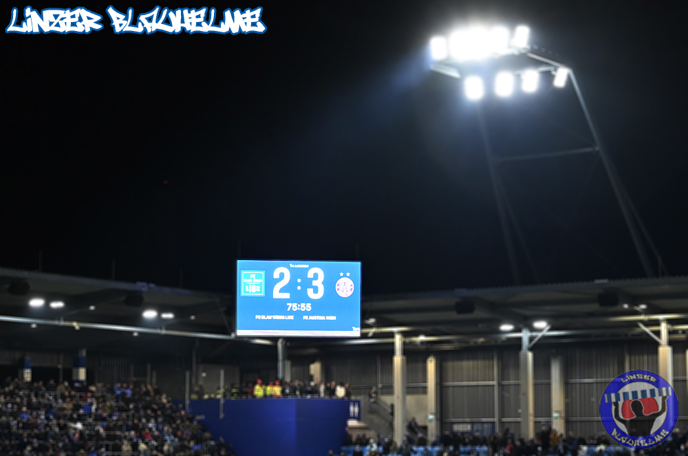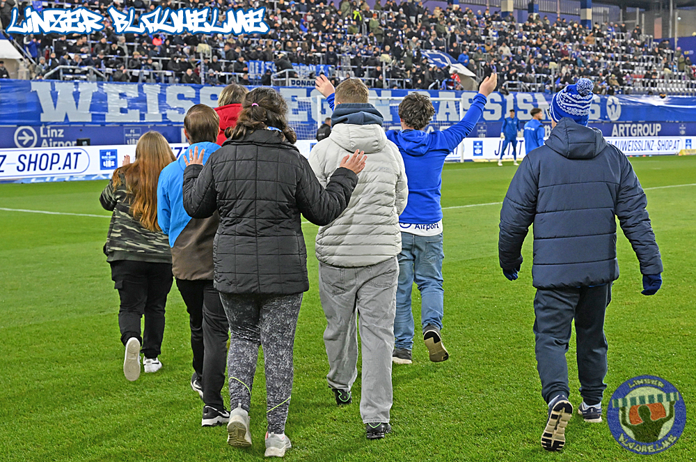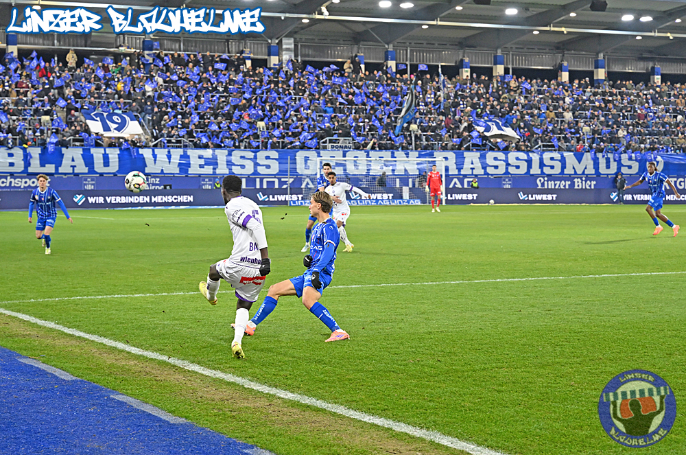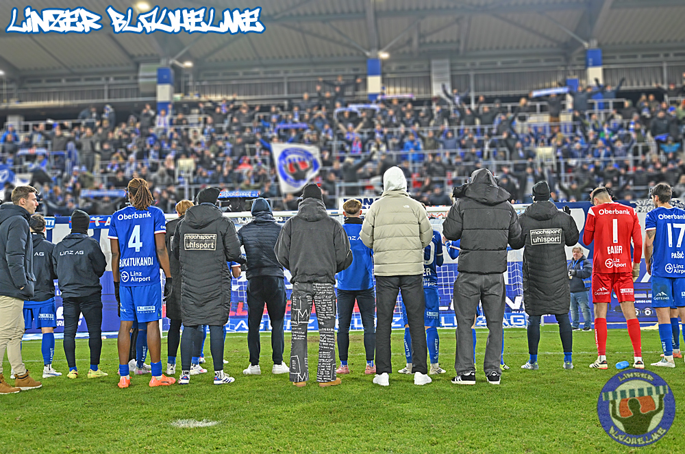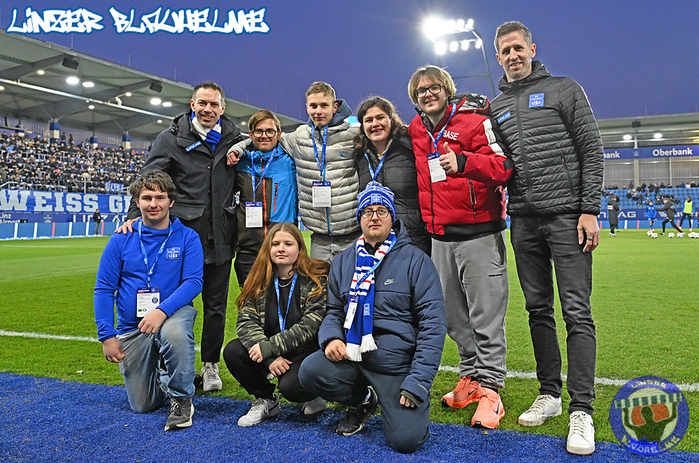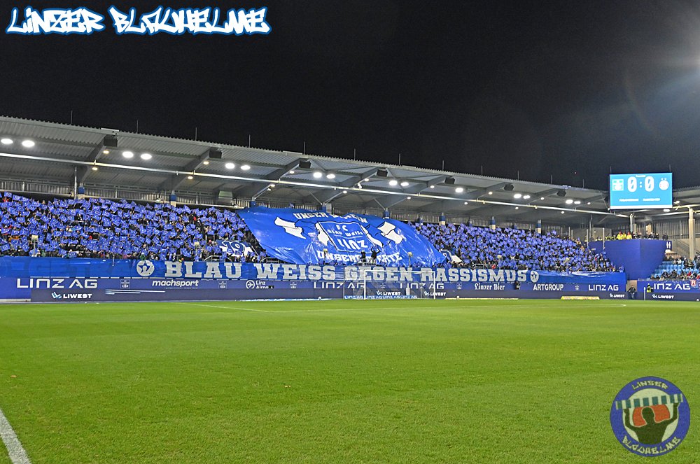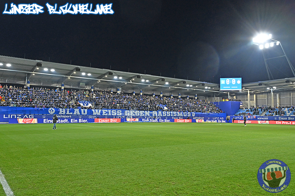 Es wäre alles angerichtet gewesen für die Trendwende – vor Spielbeginn wurde Neugründungsvater Schellmann zum 80er entsprechend gratuliert, anschließend das Special Needs Team anlässlich des kürzlich errungenen Turniersiegs beim Spielerpass Cup geehrt. Das Intro zum Match nicht weniger stark – die Arge ToR erinnerte an die Grundwerte unseres Vereins, ein Banner mit der Message BLAU WEISS GEGEN RASSISMUS wurde mit einem Überzieher im Mittelblock sowie Fahnen mit dem gleichen Motiv abgerundet.