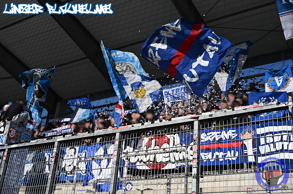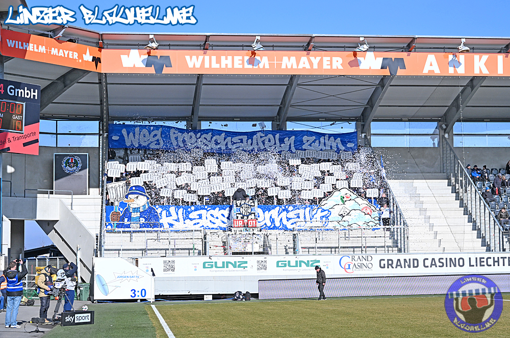 Das Intro kam diesmal von LP99 und knüpfte von der thematischen Logik her an unseres vom Cup an – die Botschaft Weg freischaufeln zum Klassenerhalt rahmte den gut gefüllten Auswärtssektor im Schnabelholz ein. In die Höhe gestreckte Schneeschaufeln, dazu die Wappen der direkten Konkurrenten – und wieder „schneite“ es in Form von Konfetti.